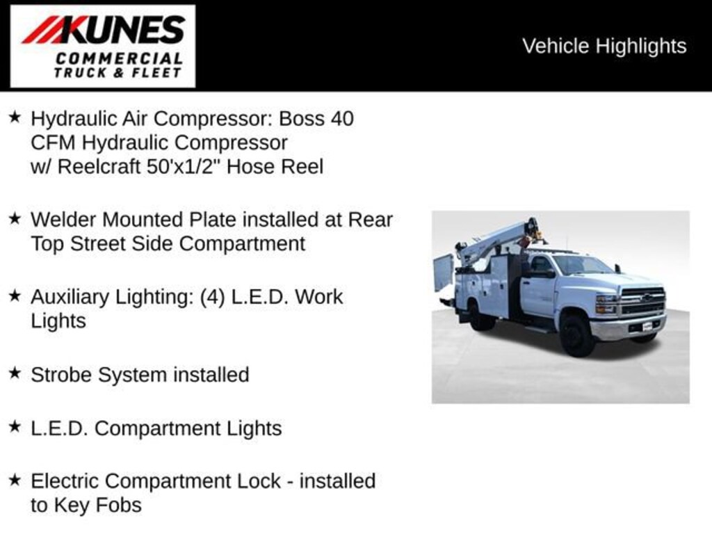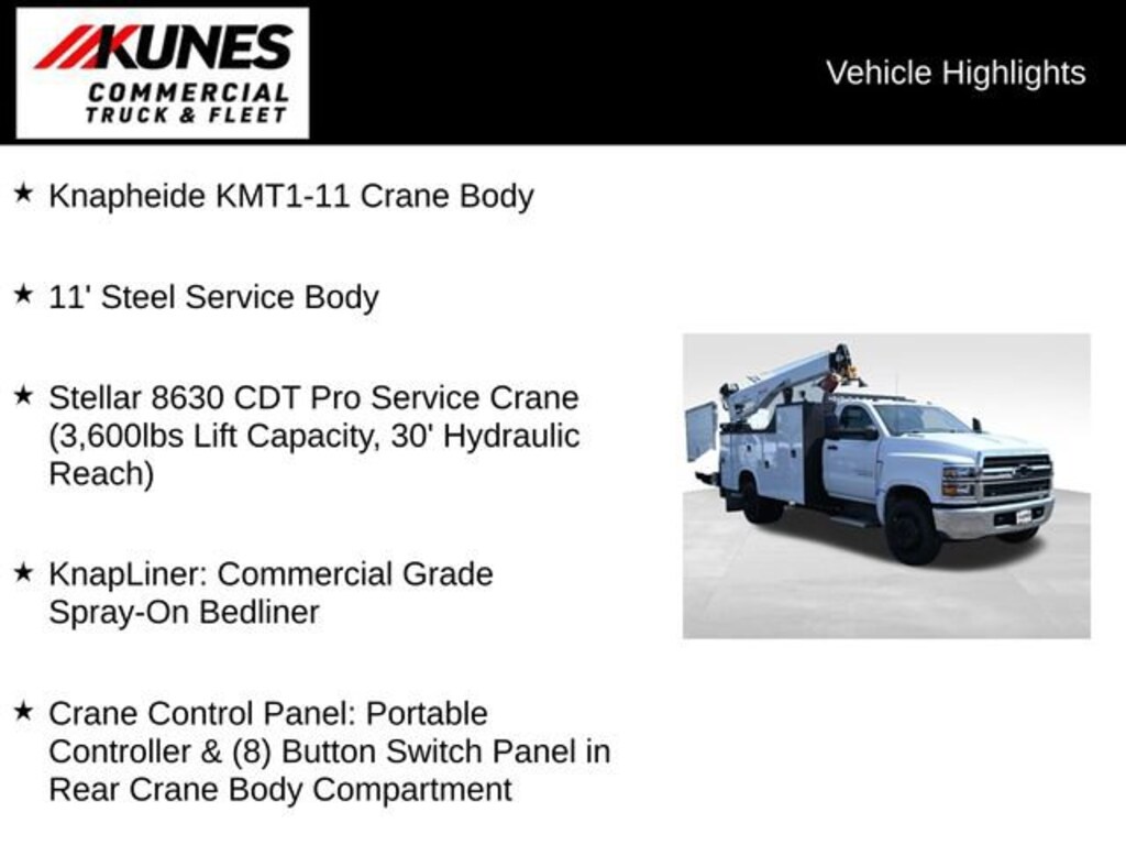 - Knapheide 11' KMT1-11 - Knapheide 11' Crane Body with Torq-Isolator Crane Support System - KnapLiner: Commercial Grade Spray-On Bedliner - Stellar 8630 CDT Pro Service Crane (Maximum 8,600lb Lifting Capacity; 30' Hydraulic Reach) - Control Panel: Power Cell, Controller and (8) Button Switch Panel in Rear Crane Compartment. - Hydraulic Air Compressor: Boss 40 CFM Hydraulic Compressor w/ Reelcraft 50'x 1/2" Hose Reel and Roller Fairlead Through the Right Rear Compartment. -Side Compartments: 44" High Side Packs and 60" High Right Front Vertical Compartments - Master Locking System: Secures One Entire Side of Compartments w/ a Padlock. - Cab Protector w/ Punched Window - Strobe System: Stop/Turn/Tail Backup Lights with Built-in Reflectivity and Integrated Strobes; (2) Amber LED Strobe Lights Installed on Front Grill - LED Compartments Lights - Electric Locks: Installed and Programmed to Key Fob - Boom Tip Light - Power Inverter: 1,500 Watts Pure Sine - Outriggers: - Backup Alarm: 97db Audible Alarm Disclosure - ****PLEASE SEE DEALER FOR COMPLETE DISCLOSURE****$112,316