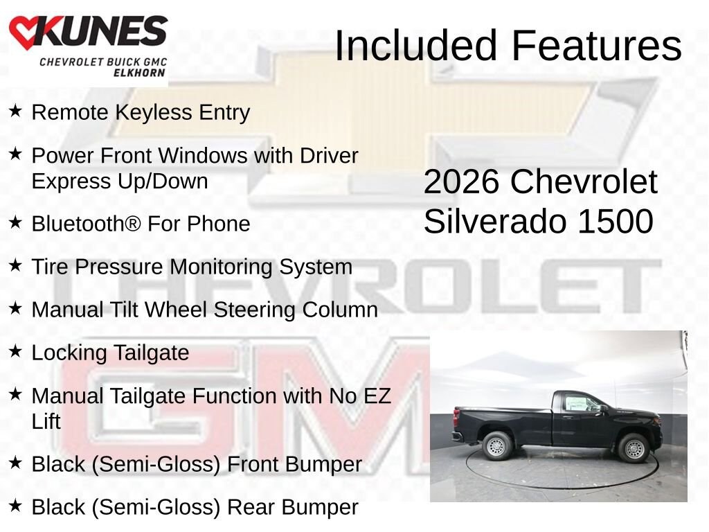 10-Speed Automatic, 4WD, Black Cloth, 3.5 Monochromatic Display Driver Info Center, 4-Way Manual Driver Seat Adjuster, 40/20/40 Front Split Bench Seat, Black (Semi-Gloss) Front Bumper, Black (Semi-Gloss) Rear Bumper, Bluetooth® For Phone, Deep-Tinted Glass, Electric Rear-Window Defogger, Electronic Cruise Control, Front Frame-Mounted Black Recovery Hooks, HD Rear Vision Camera, Heated Power-Adjustable Outside Mirrors, Hitch Guidance, Inside Rearview Mirror with Tilt, Locking Tailgate, Manual Tailgate Function with No EZ Lift, Manual Tilt Wheel Steering Column, OnStar Services Capable, Power Front Windows with Driver Express Up/Down, Power Front Windows with Passenger Express Down, Preferred Equipment Group 1WT, Remote Keyless Entry, Rubberized-Vinyl Floor Covering, SiriusXM Delete, Solar Absorbing Tinted Glass, Standard Suspension Package, Standard Tailgate, Teen Driver, Tire Pressure Monitoring System, Trailering Package, Vinyl Seat Trim, Wheels: 17 x 8 Ultra Silver Painted Steel, Wi-Fi Hot Spot Capable, WT Convenience Package, WT Value Package.