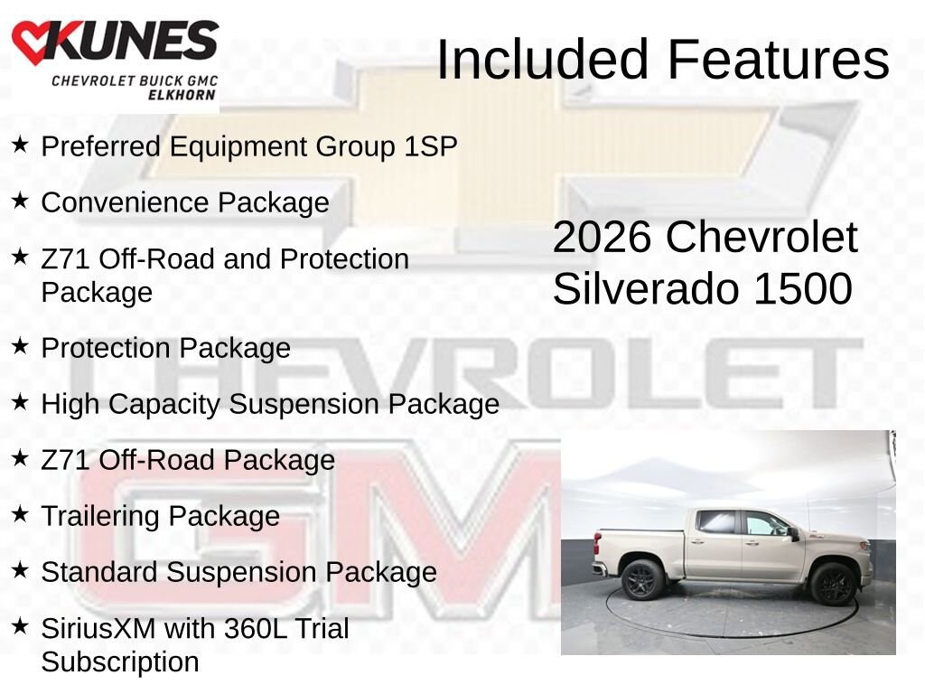 10-Speed Automatic, 4WD, Black Cloth, 10-Way Power Driver Seat with Lumbar, 12.3 Multicolor Reconfigurable Digital Display, 120-Volt Bed Mounted Power Outlet, 120-Volt Interior Power Outlet, 40/20/40 Front Split-Bench Seat, 6-Speaker Audio System, All-Star Edition, All-Weather Floor Liner, Auto-Locking Rear Differential, Bluetooth® For Phone, Chevytec Spray-on Black Bedliner, Cloth Seat Trim, Color-Keyed Carpeting Floor Covering, Convenience Package, Deep-Tinted Glass, Dual Exhaust with Polished Outlets, Dual Rear USB Ports (charge Only), Dual-Zone Automatic Climate Control, Electric Rear-Window Defogger, Electronic Cruise Control, EZ Lift Power Lock and Release Tailgate, Front Frame-Mounted Black Recovery Hooks, Front LED Fog Lamps, Front Rubberized Vinyl Floor Mats, HD Rear Vision Camera, Heated Driver and Front Outboard Passenger Seats, Heated Power-Adjustable Outside Mirrors, Heated Steering Wheel, Heavy-Duty Air Filter, High Capacity Suspension Package, High Gloss Black Mirror Caps, Hill Descent Control, Hitch Guidance, Inside Rearview Mirror with Tilt, Integrated Trailer Brake Controller, Keyless Open and Start, LED Cargo Area Lighting, Manual Tilt/Telescoping Steering Column, Off-Road Suspension, OnStar Services Capable, Power Front Windows with Driver Express Up/Down, Power Front Windows with Passenger Express Down, Power Rear Windows with Express Down, Preferred Equipment Group 1SP, Protection Package, Rear 60/40 Folding Bench Seat (folds Up), Rear Rubberized-Vinyl Floor Mats, Rear Wheelhouse Liners, Remote Vehicle Starter System, SiriusXM with 360L Trial Subscription, Standard Suspension Package, Standard Tailgate, Steering Wheel Audio Controls, Teen Driver, Theft Deterrent System (unauthorized Entry), Tire Pressure Monitoring System, Trailering Package, Wheels: 18 x 8.5 Bright Silver Painted Aluminum, Wi-Fi Hot Spot Capable, Wrapped Steering Wheel, Z71 Off-Road and Protection Package, Z71 Off-Road Package.