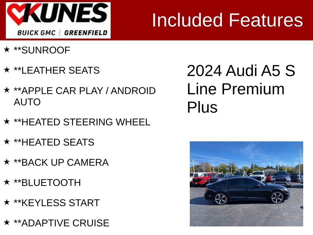 2024 Audi A5 Sportback 45 S line Premium Plus quattro Black Metallic quattro 2.0L 4-Cylinder TFSIRecent Arrival! Premium Plus Package with blind spot monitoring, rear cross-traffic alert, keyless entry, power folding mirrors, seat memory, and satellite radio Black Optic Package featuring aluminum wheels and sport performance tires Convenience Package includes rear parking sensors, HD radio, and power trunk release Sun/moonroof for open-air driving and natural light Adaptive cruise control for easier long-distance trips Heated front seats with adjustable lumbar support Premium sound system with Apple CarPlay, Bluetooth, MP3, and satellite radio Leather-trimmed seats and heated leather steering wheel Full-time quattro all-wheel drive for confident handling Rearview camera for safe reversing Power liftgate and remote trunk release LED headlights with auto-leveling and daytime running lights Auto-dimming rearview mirror to reduce glare Power adjustable front seats with driver memory Multi-zone climate control with rear air conditioning Lane departure warning and lane keeping assist Forward collision mitigation for added safety Rain-sensing automatic wipers and fog lamps Universal garage door opener and smart device integration Floor mats and cargo shade included
