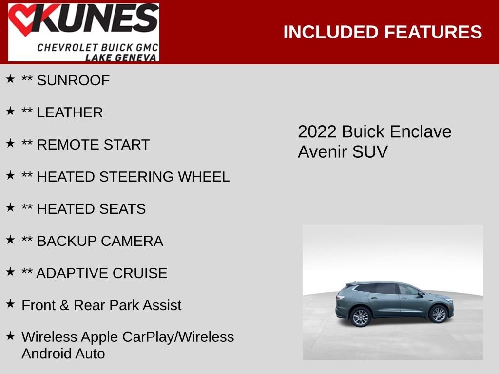 Avenir Technology Package with memory settings for driver seat, mirrors, and steering column Trailering package with heavy-duty cooling and tow hitch Power sunroof Premium Bose sound system Adaptive cruise control Heated and ventilated leather seats with massaging driver's seat Navigation with Aerial View Display System Blind spot monitoring and cross-traffic alert Lane departure warning and lane keeping assist Driver mode selector Hands-free power liftgate with remote trunk release Rearview camera with auto-dimming mirror Third row seating All-wheel drive, 3.6L V6 engine, 9-speed automatic Active suspension and premium ride package Keyless entry, keyless start, and remote engine start Power adjustable, memory front seats Automatic LED headlamps Front and rear air conditioning with multi-zone climate control Roof rails and aluminum wheels Privacy glass and rear spoiler Back-up camera with on-screen guidance