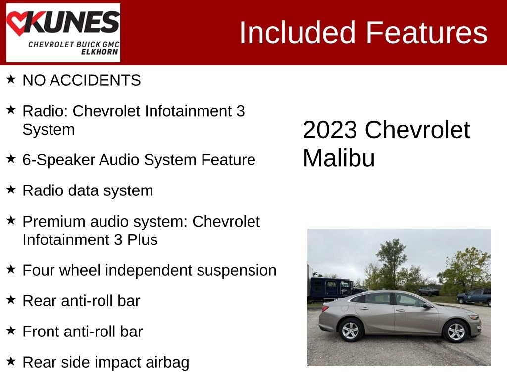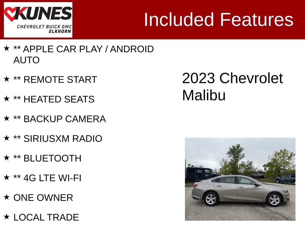 ** APPLE CAR PLAY / ANDROID AUTO, ** REMOTE START, ** HEATED SEATS, ** BACKUP CAMERA, ** SIRIUSXM RADIO, ** BLUETOOTH, ** 4G LTE WI-FI, ONE OWNER, LOCAL TRADE, NO ACCIDENTS, Jet Black Cloth, 6-Speaker Audio System Feature, Four wheel independent suspension, Front anti-roll bar, Premium audio system: Chevrolet Infotainment 3 Plus, Radio data system, Radio: Chevrolet Infotainment 3 System, Rear anti-roll bar, Rear side impact airbag, Voltmeter, Wireless Apple CarPlay/Android Auto.Certified. Certification Program Details:** NO FEAR LIFETIME CERTIFIED PREOWNED **Over $2,895 of value at no cost!*LIFETIME WARRANTY!*3 Day Exchange Policy!*Complimentary powertrain warranty with ability to upgrade to fully comprehensive coverage and/or extend up to 125,000 miles!*125+ Point Inspection by our factory trained ASE Certified technicians and reconditioned to the highest standards.*Complimentary AutoCheck History Report*Complimentary AutoCheck Buyback Protection*Financing for Everyone - Guaranteed credit approval regardless of credit history!*Over 30 lenders who compete to get you the best financing terms*No payments for up to 90 days!*Weekly, Bi-Weekly, and Monthly Payment Options for all buyers!*First Free Oil Change!*Trade anytime policy - cars, trucks, boats, RVs, motorcycles - as long as we donât have to feed it, you can trade it!Priced below KBB Fair Purchase Price!2023 Chevrolet Malibu LT 1LT 1.5L DOHC CVT FWD Clean CARFAX. CARFAX One-Owner. 27/35 City/Highway MPGFind out why our dealerships have won DealerRater.com DEALER OF THE YEAR a whopping 10 TIMES! Call, email, or live chat with one of our friendly sales professionals now to schedule your test drive! Ask about some of our other Chevrolet, GMC, Buick, Ford, Chrysler, Dodge, Jeep, Ram, Tesla, Kia, Hyundai, INFINITI, BMW, Mercedes, Toyota, Lexus, Nissan, Volkswagen, Hummer, Lincoln, Mazda, Mitsubishi, Honda, Acura, and other vehicles that may have navigation, sunroof, adaptive cruise control, leather, cooled seats, blind spot monitor, lane keep assist, panoramic moonroof, tow hitch, Bose audio, Harman Kardon, Sony, remote start, AWD, all wheel drive, 4x4, wireless charging, sirius XM, heated seats, heated steering wheel, V8, diesel, chrome, bed-liner, luggage rack, sensing, power folding mirrors, 5th wheel, gooseneck, autopilot, self-driving, EV, remote locking tailgate, LT, LTZ, High Country, LX, EX, EX-L, DVD, rear entertainment, rear bucket seats, S, SV, SL, premium, black edition, soft top, hard top, convertible, rally stripes, GT, Shelby, Z71, XL, XLT, Lariat, Denali, SLT, SLE, RS, Rebel, Preferred, Premier, Essence, Limited, Luxury, and more. Prices shown do not include tax, title, registration and $599 service fees.