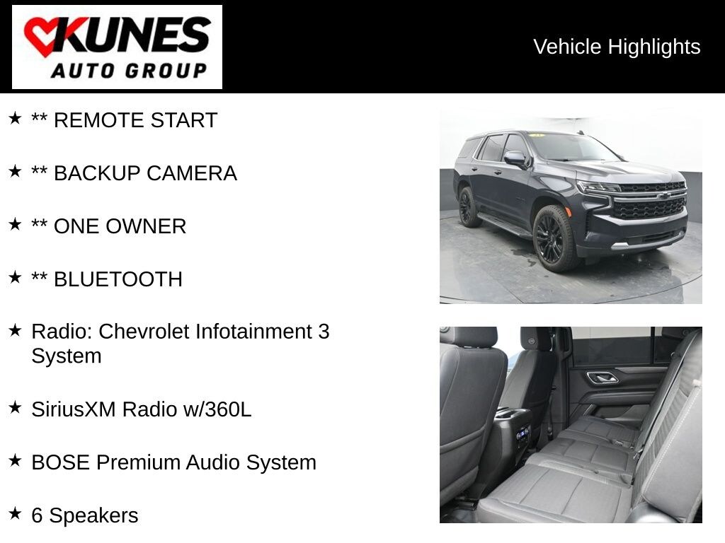 ** REMOTE START, ** BACKUP CAMERA, ** ONE OWNER, ** BLUETOOTH, 4WD, Jet Black Cloth, 1st & 2nd Row Color-Keyed Carpeted Floor Mats, 3.23 Rear Axle Ratio, 6 Speakers, AM/FM radio: SiriusXM with 360L, Apple CarPlay/Android Auto, BOSE Premium Audio System, Color-Keyed Carpeting Floor Covering, Compass, Delay-off headlights, Driver & Front Outboard Passenger Airbags, Front Bucket Seats, Front Center Armrest, Front High-Back Reclining Bucket Seats, Front reading lights, Illuminated entry, Low tire pressure warning, Occupant sensing airbag, Outside temperature display, Panic alarm, Power passenger seat, Radio: Chevrolet Infotainment 3 System, Rear anti-roll bar, Rear reading lights, Rear seat center armrest, Security system, SiriusXM Radio w/360L, Speed-sensing steering, Split folding rear seat, Tachometer, Telescoping steering wheel, Tilt steering wheel, Trip computer, Voltmeter, Wheels: 22" Multi-Spoke Gloss Black (LPO), Wrapped Steering Wheel.