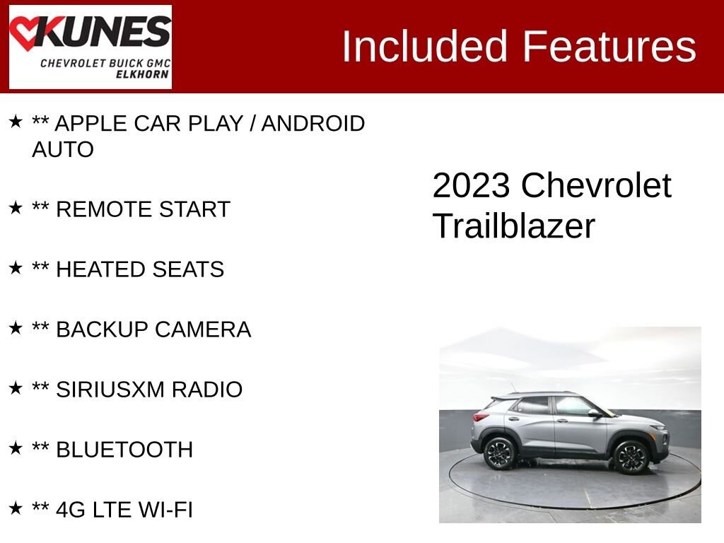 2023 Chevrolet TrailBlazer LT Sterling Gray Metallic AWD 1.3L Ecotec Turbo DOHC SIDI w/VVTRecent Arrival! CARFAX One Owner. LT Preferred Equipment Group with heated front seat, heated power mirrors, and alloy wheels Front and rear air bags plus advanced driver safety technology All-wheel drive with 9-speed automatic transmission Remote engine start and keyless entry/start convenience Backup camera for confident reversing Apple CarPlay, Android Auto, and Bluetooth connectivity Adaptive cruise control not equipped Automatic headlights with high-beam assist for better nighttime driving Fog lamps and privacy glass for enhanced style and function Power driver seat with adjustable lumbar support Pass-through and 60/40 split rear bench seat for flexible cargo space Cruise control and steering wheel audio controls for convenience Tire pressure monitoring and electronic parking brake Anti-lock 4-wheel disc brakes and electronic stability features Satellite radio and WiFi hotspot capability Active noise cancellation for a quieter cabin Rear child safety locks and LATCH anchors for car seats Manual liftgate and aluminum wheels Compass display and driver/front passenger assist handles Temporary spare tire and mechanical jack included