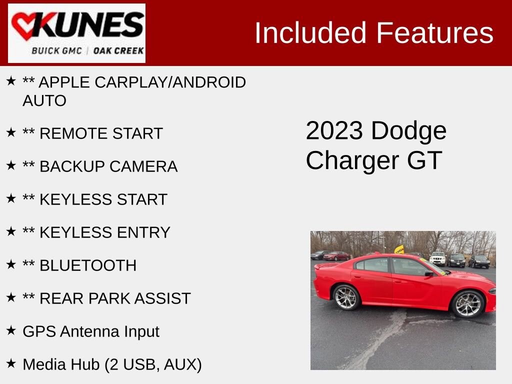 2023 Dodge Charger GT Torred Clearcoat RWD 3.6L V6 24V VVTRecent Arrival! Clean CARFAX. CARFAX One Owner. Premium sound system for enhanced audio Keyless entry and keyless start Remote engine start Rear parking aid and back-up camera 3.6L V6 engine with 8-speed automatic transmission Rear-wheel drive for sporty handling 8.4 touchscreen display Power driver seat with adjustable lumbar support Leather-wrapped steering wheel Heated mirrors and power mirrors Multi-zone climate control and air conditioning Cruise control AM/FM, HD, and satellite radio plus MP3 and auxiliary input Apple CarPlay and Android Auto integration Bluetooth connection and WiFi hotspot Power windows and door locks Rear bench seat with pass-through Dual stainless steel exhaust with chrome tips Sport-tuned suspension and performance tires Traction control, stability control, and brake assist Advanced airbag system with front, side, and head airbags Tire pressure monitor and child safety locks
