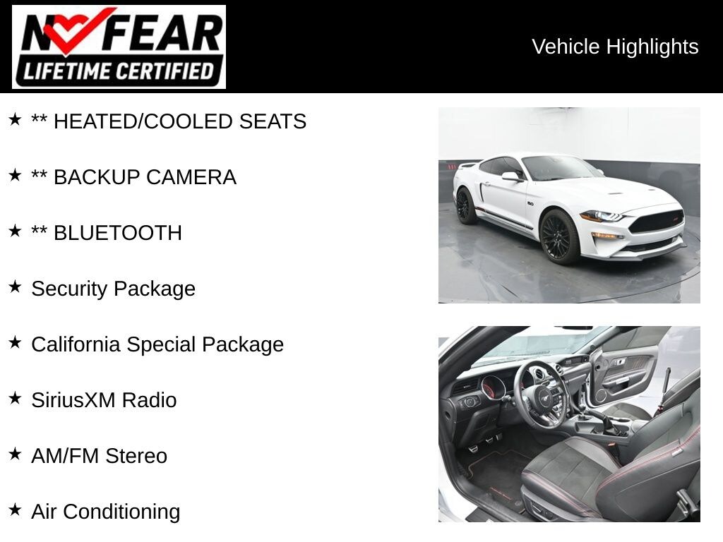 ** HEATED/COOLED SEATS, ** BACKUP CAMERA, ** BLUETOOTH, 4-Wheel Disc Brakes, Active Anti-Theft System, Air Conditioning, AM/FM Stereo, Auto High-beam Headlights, Brake assist, California Special Package, California Special Script Rear Badging, Electronic Stability Control, Exterior Parking Camera Rear, Floor Mats w/Red Contrast Stitching, Four wheel independent suspension, Leather-Trimmed Bucket Seats w/Miko Suede Inserts, Mesh 45 Aluminum Instrument Panel, Miko Suede Door Inserts w/Red Contrast Stitching, Panic alarm, Power driver seat, Rear Parking Sensors, Security Package, Security system, Side Scoops, SiriusXM Radio, Speed control, Speed-sensing steering, SYNC 3 Communications & Entertainment System, Unique Front Honeycomb Grilles w/GT/CS Badge, Wheel Locking Kit, Wheels: 19" x 8.5" Machined-Face Aluminum.