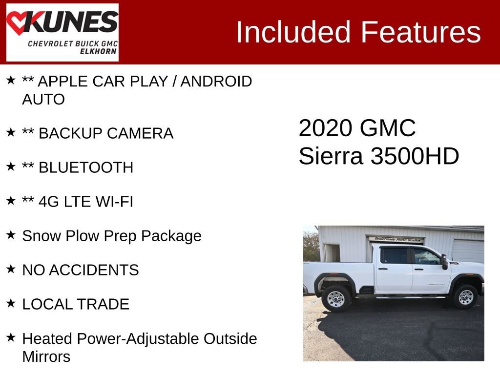 2020 GMC Sierra 3500HD Base Summit White 4WD 6.6L V8Recent Arrival! Clean CARFAX.NO FEAR LIFETIME CERTIFIED PREOWNED **Over $2,895 of value at no cost!LIFETIME WARRANTY!3 Day Exchange Policy!Complimentary powertrain warranty with ability to upgrade to fully comprehensive coverage and/or extend up to 125,000 miles!125+ Point Inspection by our factory trained ASE Certified technicians and reconditioned to the highest standards.Complimentary AutoCheck History ReportComplimentary AutoCheck Buyback ProtectionFinancing for Everyone - Guaranteed credit approval regardless of credit history!Over 30 lenders who compete to get you the best financing termsNo payments for up to 90 days!Weekly, Bi-Weekly, and Monthly Payment Options for all buyers!First Free Oil Change!Trade anytime policy - cars, trucks, boats, RVs, motorcycles - as long as we don't have to feed it, you can trade it! Convenience Package with cruise control, heated mirrors, keyless entry, power door locks, power mirrors, rear defrost Snow Plow Prep/Camper Package Integrated trailer brake controller Running boards Back-up camera 6.6L V8 engine 6-speed automatic transmission Four-wheel drive Cloth seats and split bench seat Apple CarPlay, Bluetooth, and smart device integration Auxiliary audio input and MP3 player Rear bench seat with pass-through Power windows and power outlet Tow hitch and tow hooks Front and rear all-terrain tires Skid plates Daytime running lights Tire pressure monitor, stability control, traction control Dual front, side, and head airbags Rear seat reminder (Crew Cab) LED cargo area lighting 11,350 lbs GVWR single rear wheels
