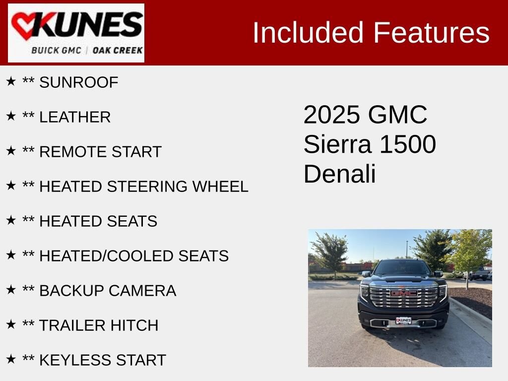 Denali Reserve Package with power retractable running boards, premium aluminum wheels, and sun/moonroof Technology Package with back-up camera and heads-up display Up-level rear seat with storage and 60/40 split-fold bench Trailering Package with integrated tow hitch Adaptive cruise control and cruise control Premium sound system Heated mirrors, power folding mirrors, and mirror memory Keyless entry, keyless start, and remote engine start Front and rear parking sensors with backup camera Running boards and power retractable running boards Aluminum wheels and bed liner Tonneau cover included Sun/moonroof for added light Integrated tailgate step and rear sliding window Fog lamps, LED headlights, and privacy glass 6.2L V8 engine with 10-speed automatic transmission, four-wheel drive Multi-zone air conditioning and climate control Rear defrost and rear seat pass-through Lane departure warning, lane keeping assist, blind spot monitoring Front collision warning, brake assist, and automatic highbeams