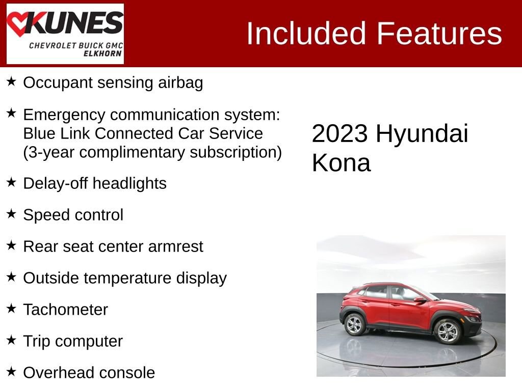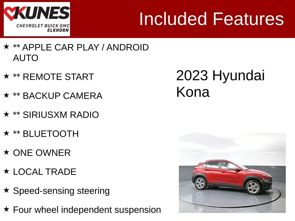 2023 Hyundai Kona SEL Pulse Red AWD 2.0L I4 DOHC Dual CVVTRecent Arrival! Clean CARFAX. CARFAX One Owner.NO FEAR LIFETIME CERTIFIED PREOWNED **Over $2,895 of value at no cost!LIFETIME WARRANTY!3 Day Exchange Policy!Complimentary powertrain warranty with ability to upgrade to fully comprehensive coverage and/or extend up to 125,000 miles!125+ Point Inspection by our factory trained ASE Certified technicians and reconditioned to the highest standards.Complimentary AutoCheck History ReportComplimentary AutoCheck Buyback ProtectionFinancing for Everyone - Guaranteed credit approval regardless of credit history!Over 30 lenders who compete to get you the best financing termsNo payments for up to 90 days!Weekly, Bi-Weekly, and Monthly Payment Options for all buyers!First Free Oil Change!Trade anytime policy - cars, trucks, boats, RVs, motorcycles - as long as we don't have to feed it, you can trade it! Includes Floor Mats, Front & Rear Mudguards, Cargo Tray, Cargo Net, and First Aid Kit Heated mirrors with integrated turn signals Blind spot monitor and rear cross-traffic alert Back-up camera and rear parking sensors 2.0L I4 engine with automatic full-time all-wheel drive Apple CarPlay and Android Auto compatibility Bluetooth connection and MP3/auxiliary audio input Remote engine start with smart device integration Keyless entry and push-button start Cruise control with steering assist Automatic headlights and daytime running lights Privacy glass, roof spoiler, and aluminum wheels Bucket seats with driver power adjustments Air conditioning and air filtration system Lane keeping assist and lane departure warning Front collision mitigation and driver monitoring AM/FM/HD radio, satellite radio, and steering wheel audio controls Full suite of airbags including front, side, and head airbags Power windows and power door locks
