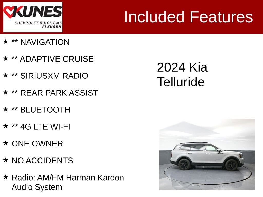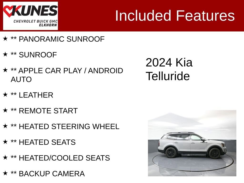 2024 Kia Telluride SX-Prestige X-Pro Wolf Gray AWD 3.8L V6 DOHCRecent Arrival! Clean CARFAX. CARFAX One Owner.NO FEAR LIFETIME CERTIFIED PREOWNED **Over $2,895 of value at no cost!LIFETIME WARRANTY!3 Day Exchange Policy!Complimentary powertrain warranty with ability to upgrade to fully comprehensive coverage and/or extend up to 125,000 miles!125+ Point Inspection by our factory trained ASE Certified technicians and reconditioned to the highest standards.Complimentary AutoCheck History ReportComplimentary AutoCheck Buyback ProtectionFinancing for Everyone - Guaranteed credit approval regardless of credit history!Over 30 lenders who compete to get you the best financing termsNo payments for up to 90 days!Weekly, Bi-Weekly, and Monthly Payment Options for all buyers!First Free Oil Change!Trade anytime policy - cars, trucks, boats, RVs, motorcycles - as long as we don't have to feed it, you can trade it! Wolf Gray exterior paint Floor mats Dual moonroof and panoramic sunroof Premium sound system Navigation system Blind spot monitor Heated front and rear bucket seats Cooled front and rear seats Power adjustable, massaging front seats with memory Heated leather steering wheel Remote engine start and smart device integration Hands-free power liftgate Back-up camera and rear parking aid Rain sensing and variable speed intermittent wipers Automatic LED headlights and fog lamps Adaptive cruise control (Cruise Control Steering Assist) Lane keeping assist and lane departure warning Aluminum wheels with all-terrain tires 3rd row seating WiFi hotspot and Apple CarPlay/Android Auto Heads-up display 8-speed automatic, all-wheel drive with drive modes