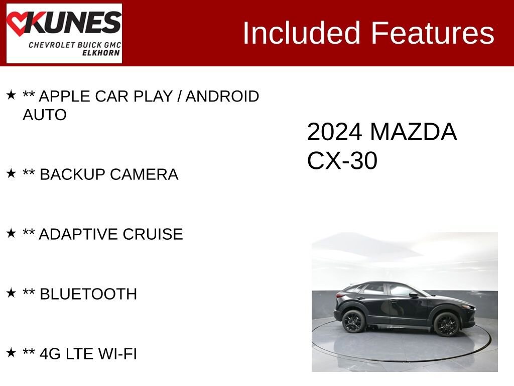 2024 Mazda CX-30 2.5 S Select Sport Jet Black Mica AWD SKYACTIV® 2.5L 4-Cylinder DOHC 16VRecent Arrival! Clean CARFAX. CARFAX One Owner. Adaptive cruise control for safer, easier highway driving Blind spot monitor and cross-traffic alert for added confidence Back-up camera for easier reversing and parking Premium synthetic seats with 8-way power driverâs seat All-wheel drive with 2.5L I-4 engine and 6-speed automatic Android Auto, Apple CarPlay, Bluetooth, and two LCD displays Heated mirrors with integrated turn signals Automatic LED headlights, highbeams, and rain-sensing wipers Smart device integration plus WiFi hotspot Pass-through and rear bench seat for flexible cargo solutions Rear spoiler and aluminum wheels for a sporty look Leather-wrapped, adjustable steering wheel with audio controls Power windows, keyless entry, push-button start, and power locks Air conditioning with climate and multi-zone control Lane departure warning and lane keeping assist Front collision mitigation with full suite of airbags Traction and stability control, anti-lock disc brakes Driver monitoring system for enhanced safety Rear defrost and privacy glass Tire pressure monitoring system for peace of mind