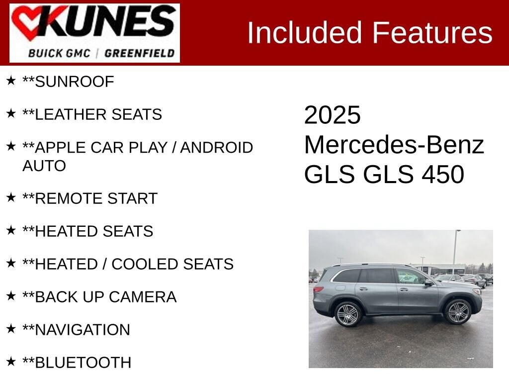 **SUNROOF, **LEATHER SEATS, **APPLE CAR PLAY / ANDROID AUTO, **REMOTE START, **HEATED SEATS, **HEATED / COOLED SEATS, **BACK UP CAMERA, **NAVIGATION, **BLUETOOTH, **WIRELESS CHARGING, **KEYLESS START, **ADAPTIVE CRUISE, **ALL WHEEL DRIVE, **REAR PARK ASSIST, **GREAT FUEL ENCONOMY, **WHOLESALE PRICING, **AFFORDABLE FINANCING, **NON SMOKER, **CLEAN CARFAX, **LOW MILEAGE! GREAT CONDITION!, **LOW MILEAGE, **LANE DEPARTURE WARNING, **KEYLESS ENTRY, **BLIND SPOT MONITOR, **HEADS UP DISPLAY. CARFAX One-Owner. Clean CARFAX. Certified. Recent Arrival!Gray 2025 Mercedes-Benz GLS GLS 450 4MATIC® 4D Sport Utility 4MATIC® 9-Speed Automatic 3.0L I6Certification Program Details:** NO FEAR LIFETIME CERTIFIED PREOWNED **Over $2,895 of value at no cost!*LIFETIME WARRANTY!*3 Day Exchange Policy!*Complimentary powertrain warranty with ability to upgrade to fully comprehensive coverage and/or extend up to 125,000 miles!*125+ Point Inspection by our factory trained ASE Certified technicians and reconditioned to the highest standards.*Complimentary AutoCheck History Report*Complimentary AutoCheck Buyback Protection*Financing for Everyone - Guaranteed credit approval regardless of credit history!*Over 30 lenders who compete to get you the best financing terms*No payments for up to 90 days!*Weekly, Bi-Weekly, and Monthly Payment Options for all buyers!*First Free Oil Change!*Trade anytime policy - cars, trucks, boats, RVs, motorcycles - as long as we don’t have to feed it, you can trade it!Find out why our dealerships have won DealerRater.com DEALER OF THE YEAR a whopping 10 TIMES! Call, email, or live chat with one of our friendly sales professionals now to schedule your test drive! Prices shown do not include tax, title, registration and $599 service fees.