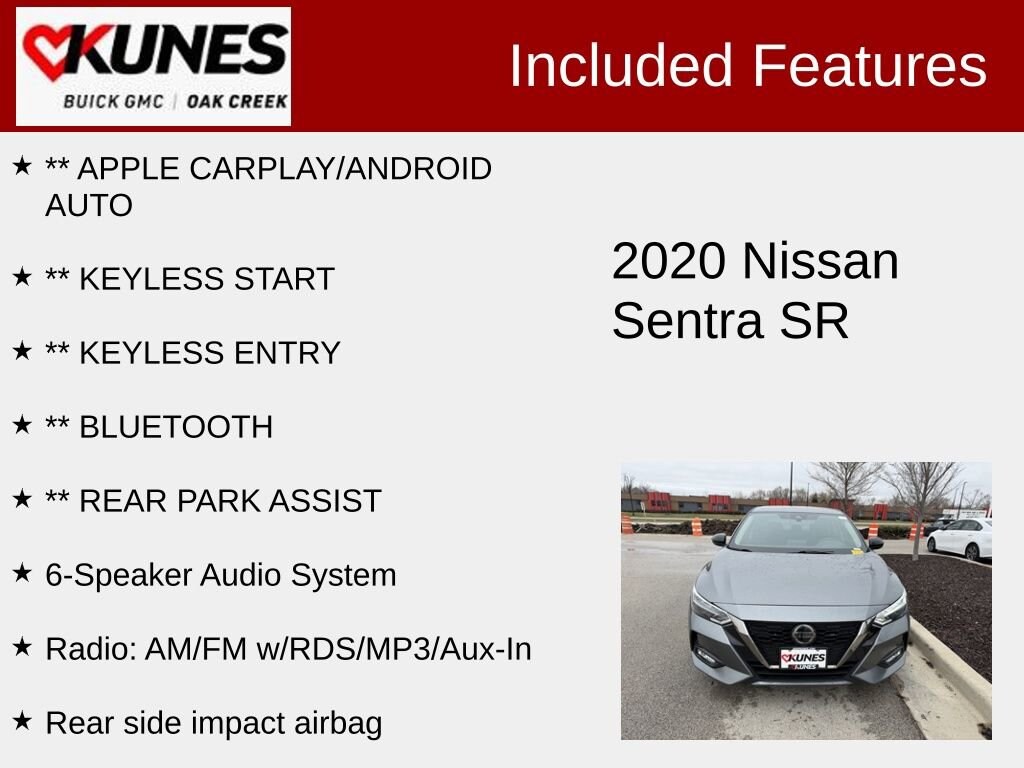 2020 Nissan Sentra SR Gun Metallic FWD 2.0L DOHCRecent Arrival! Clean CARFAX. CARFAX One Owner. Premium carpeted floor mats included as an added option. Trunk package with convenience shelf board upgrade. Apple CarPlay and Android Auto smartphone integration. Blind spot monitoring system for enhanced safety. Rear cross traffic alert for easier reversing. Lane departure warning and lane departure prevention. Intelligent forward collision warning and emergency braking with pedestrian detection. Rear automatic braking and rear sonar sensors. Rear door alert feature for added convenience. Intelligent cruise control for adaptive highway driving. Nissan intelligent key system with remote engine start. Dual zone automatic climate control. Heated front seats and steering wheel. Power driver seat with sport cloth finish. 7-inch advanced drive-assist display and 8-inch NissanConnect touchscreen. Bluetooth hands-free phone system and streaming audio. SiriusXM radio capability and 6-speaker audio system. LED headlights, signature LED daytime running lights, LED fog lights, and LED tail lights. Sport exterior trim with 18-inch alloy wheels and body-color sport rear spoiler. Rear view monitor and intelligent driver alertness.