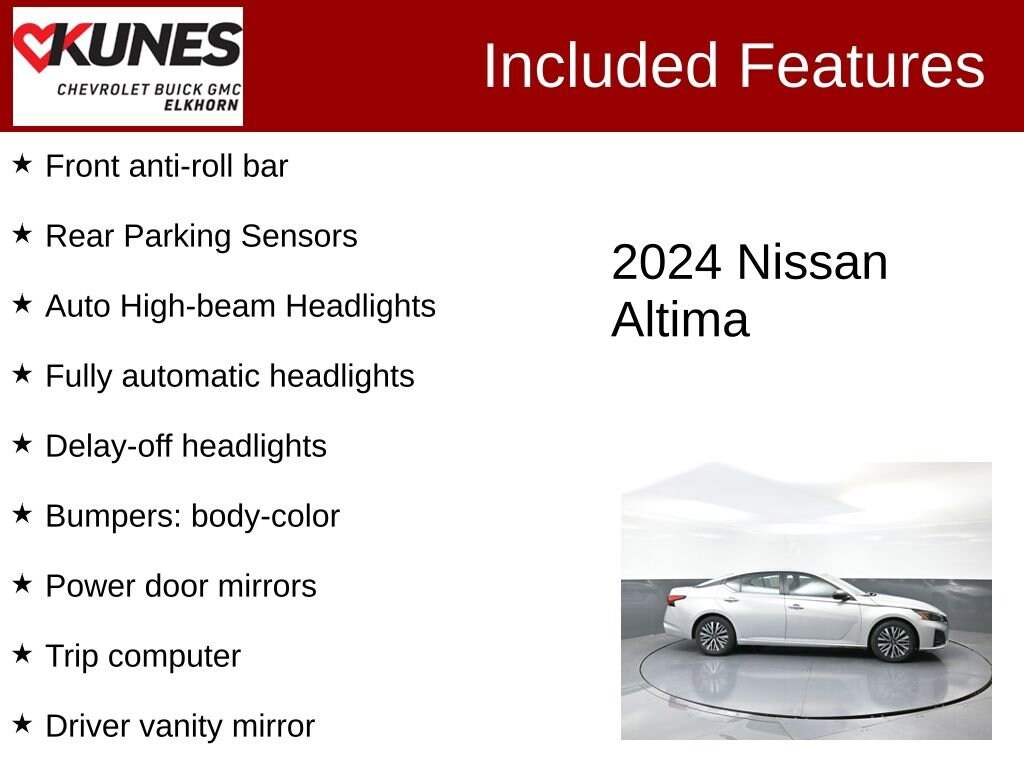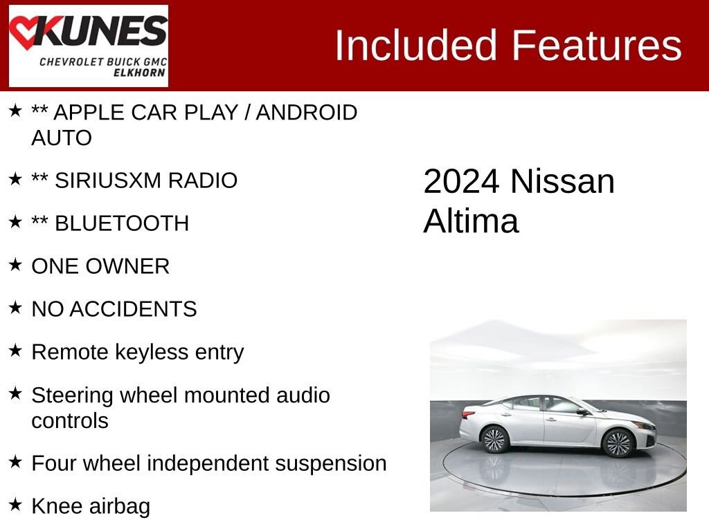 ** APPLE CAR PLAY / ANDROID AUTO, ** SIRIUSXM RADIO, ** BLUETOOTH, ONE OWNER, NO ACCIDENTS, CVT with Xtronic, Auto High-beam Headlights, Bumpers: body-color, Delay-off headlights, Driver door bin, Driver vanity mirror, Four wheel independent suspension, Front anti-roll bar, Front reading lights, Fully automatic headlights, Illuminated entry, Knee airbag, Outside temperature display, Overhead console, Passenger vanity mirror, Power door mirrors, Rear Parking Sensors, Rear reading lights, Rear seat center armrest, Remote keyless entry, Speed-Sensitive Wipers, Split folding rear seat, Steering wheel mounted audio controls, Tachometer, Telescoping steering wheel, Tilt steering wheel, Trip computer.Certified. Certification Program Details:** NO FEAR LIFETIME CERTIFIED PREOWNED **Over $2,895 of value at no cost!*LIFETIME WARRANTY!*3 Day Exchange Policy!*Complimentary powertrain warranty with ability to upgrade to fully comprehensive coverage and/or extend up to 125,000 miles!*125+ Point Inspection by our factory trained ASE Certified technicians and reconditioned to the highest standards.*Complimentary AutoCheck History Report*Complimentary AutoCheck Buyback Protection*Financing for Everyone - Guaranteed credit approval regardless of credit history!*Over 30 lenders who compete to get you the best financing terms*No payments for up to 90 days!*Weekly, Bi-Weekly, and Monthly Payment Options for all buyers!*First Free Oil Change!*Trade anytime policy - cars, trucks, boats, RVs, motorcycles - as long as we donât have to feed it, you can trade it!2024 Nissan Altima 2.5 SV 2.5L 4-Cylinder DOHC 16V CVT with Xtronic FWD Clean CARFAX. CARFAX One-Owner. 27/39 City/Highway MPGFind out why our dealerships have won DealerRater.com DEALER OF THE YEAR a whopping 10 TIMES! Call, email, or live chat with one of our friendly sales professionals now to schedule your test drive! Ask about some of our other Chevrolet, GMC, Buick, Ford, Chrysler, Dodge, Jeep, Ram, Tesla, Kia, Hyundai, INFINITI, BMW, Mercedes, Toyota, Lexus, Nissan, Volkswagen, Hummer, Lincoln, Mazda, Mitsubishi, Honda, Acura, and other vehicles that may have navigation, sunroof, adaptive cruise control, leather, cooled seats, blind spot monitor, lane keep assist, panoramic moonroof, tow hitch, Bose audio, Harman Kardon, Sony, remote start, AWD, all wheel drive, 4x4, wireless charging, sirius XM, heated seats, heated steering wheel, V8, diesel, chrome, bed-liner, luggage rack, sensing, power folding mirrors, 5th wheel, gooseneck, autopilot, self-driving, EV, remote locking tailgate, LT, LTZ, High Country, LX, EX, EX-L, DVD, rear entertainment, rear bucket seats, S, SV, SL, premium, black edition, soft top, hard top, convertible, rally stripes, GT, Shelby, Z71, XL, XLT, Lariat, Denali, SLT, SLE, RS, Rebel, Preferred, Premier, Essence, Limited, Luxury, and more. Prices shown do not include tax, title, registration and $499 service fees.