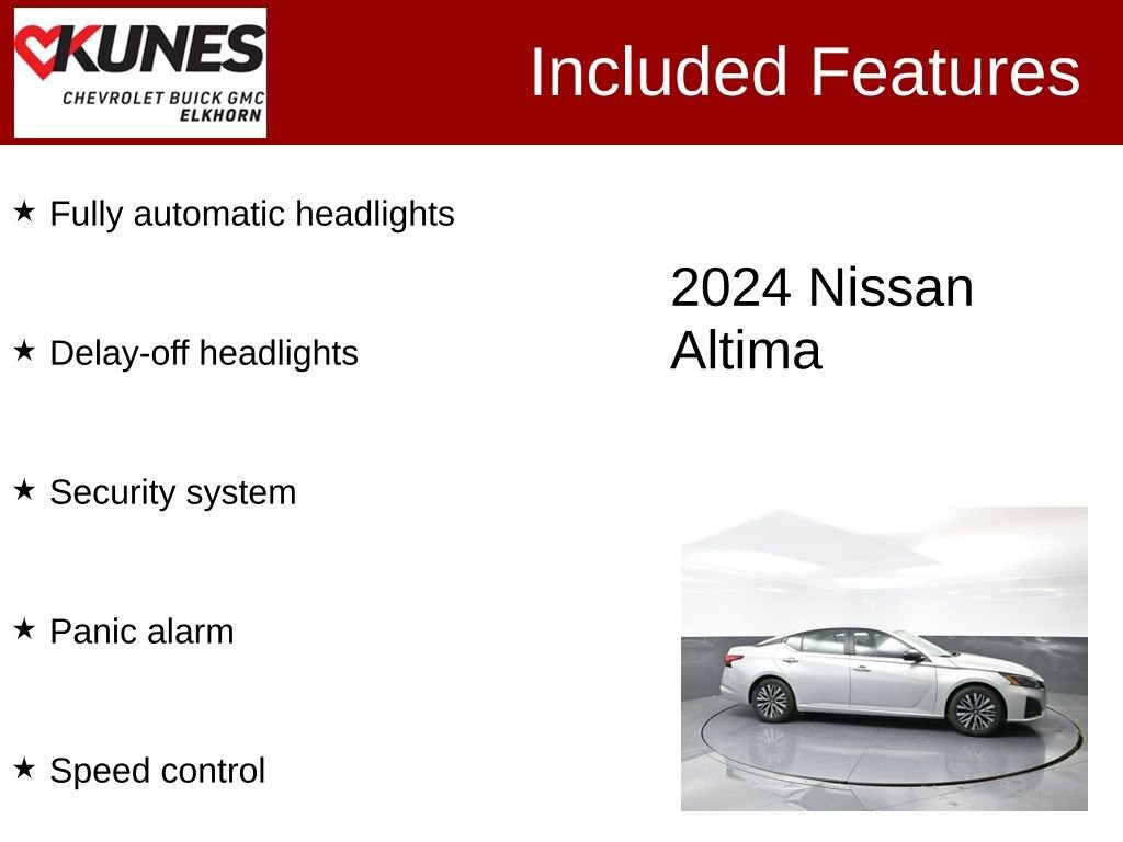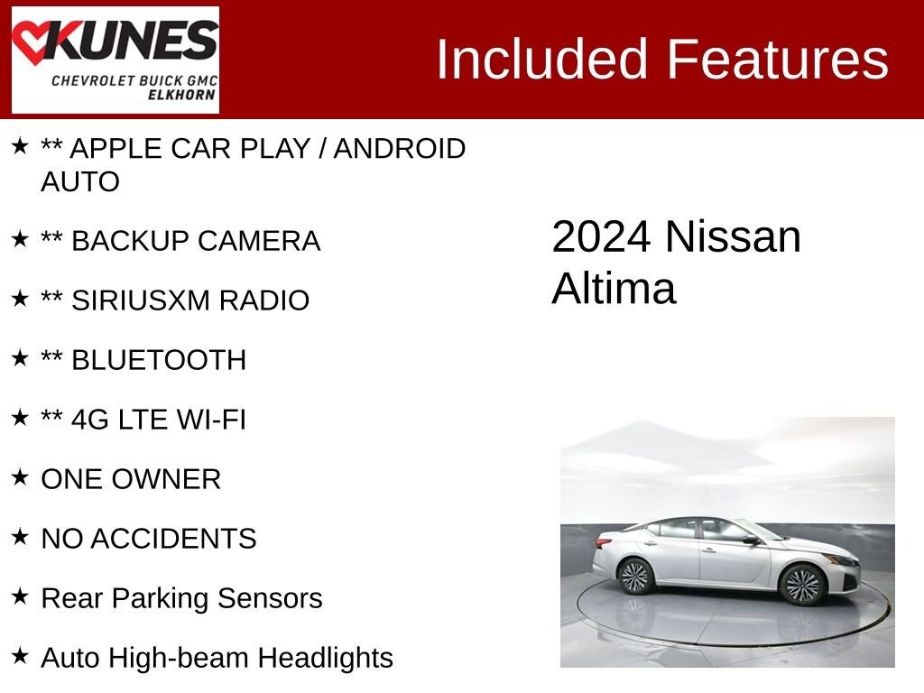 ** APPLE CAR PLAY / ANDROID AUTO, ** BACKUP CAMERA, ** SIRIUSXM RADIO, ** BLUETOOTH, ** 4G LTE WI-FI, ONE OWNER, NO ACCIDENTS, CVT with Xtronic, Auto High-beam Headlights, Delay-off headlights, Fully automatic headlights, Panic alarm, Rear Parking Sensors, Security system, Speed control.Certified. Certification Program Details:** NO FEAR LIFETIME CERTIFIED PREOWNED **Over $2,895 of value at no cost!*LIFETIME WARRANTY!*3 Day Exchange Policy!*Complimentary powertrain warranty with ability to upgrade to fully comprehensive coverage and/or extend up to 125,000 miles!*125+ Point Inspection by our factory trained ASE Certified technicians and reconditioned to the highest standards.*Complimentary AutoCheck History Report*Complimentary AutoCheck Buyback Protection*Financing for Everyone - Guaranteed credit approval regardless of credit history!*Over 30 lenders who compete to get you the best financing terms*No payments for up to 90 days!*Weekly, Bi-Weekly, and Monthly Payment Options for all buyers!*First Free Oil Change!*Trade anytime policy - cars, trucks, boats, RVs, motorcycles - as long as we donât have to feed it, you can trade it!2024 Nissan Altima 2.5 SV 2.5L 4-Cylinder DOHC 16V CVT with Xtronic FWD Clean CARFAX. CARFAX One-Owner. 27/39 City/Highway MPGFind out why our dealerships have won DealerRater.com DEALER OF THE YEAR a whopping 10 TIMES! Call, email, or live chat with one of our friendly sales professionals now to schedule your test drive! Ask about some of our other Chevrolet, GMC, Buick, Ford, Chrysler, Dodge, Jeep, Ram, Tesla, Kia, Hyundai, INFINITI, BMW, Mercedes, Toyota, Lexus, Nissan, Volkswagen, Hummer, Lincoln, Mazda, Mitsubishi, Honda, Acura, and other vehicles that may have navigation, sunroof, adaptive cruise control, leather, cooled seats, blind spot monitor, lane keep assist, panoramic moonroof, tow hitch, Bose audio, Harman Kardon, Sony, remote start, AWD, all wheel drive, 4x4, wireless charging, sirius XM, heated seats, heated steering wheel, V8, diesel, chrome, bed-liner, luggage rack, sensing, power folding mirrors, 5th wheel, gooseneck, autopilot, self-driving, EV, remote locking tailgate, LT, LTZ, High Country, LX, EX, EX-L, DVD, rear entertainment, rear bucket seats, S, SV, SL, premium, black edition, soft top, hard top, convertible, rally stripes, GT, Shelby, Z71, XL, XLT, Lariat, Denali, SLT, SLE, RS, Rebel, Preferred, Premier, Essence, Limited, Luxury, and more. Prices shown do not include tax, title, registration and $499 service fees.