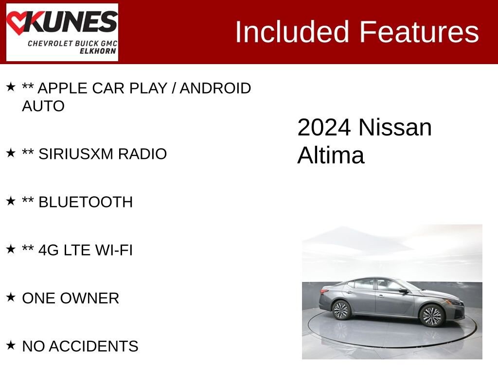 ** APPLE CAR PLAY / ANDROID AUTO, ** SIRIUSXM RADIO, ** BLUETOOTH, ** 4G LTE WI-FI, ONE OWNER, NO ACCIDENTS, CVT with Xtronic.Certified. Certification Program Details:** NO FEAR LIFETIME CERTIFIED PREOWNED **Over $2,895 of value at no cost!*LIFETIME WARRANTY!*3 Day Exchange Policy!*Complimentary powertrain warranty with ability to upgrade to fully comprehensive coverage and/or extend up to 125,000 miles!*125+ Point Inspection by our factory trained ASE Certified technicians and reconditioned to the highest standards.*Complimentary AutoCheck History Report*Complimentary AutoCheck Buyback Protection*Financing for Everyone - Guaranteed credit approval regardless of credit history!*Over 30 lenders who compete to get you the best financing terms*No payments for up to 90 days!*Weekly, Bi-Weekly, and Monthly Payment Options for all buyers!*First Free Oil Change!*Trade anytime policy - cars, trucks, boats, RVs, motorcycles - as long as we donât have to feed it, you can trade it!2024 Nissan Altima 2.5 SV 2.5L 4-Cylinder DOHC 16V CVT with Xtronic FWD Clean CARFAX. CARFAX One-Owner. 27/39 City/Highway MPGFind out why our dealerships have won DealerRater.com DEALER OF THE YEAR a whopping 10 TIMES! Call, email, or live chat with one of our friendly sales professionals now to schedule your test drive! Ask about some of our other Chevrolet, GMC, Buick, Ford, Chrysler, Dodge, Jeep, Ram, Tesla, Kia, Hyundai, INFINITI, BMW, Mercedes, Toyota, Lexus, Nissan, Volkswagen, Hummer, Lincoln, Mazda, Mitsubishi, Honda, Acura, and other vehicles that may have navigation, sunroof, adaptive cruise control, leather, cooled seats, blind spot monitor, lane keep assist, panoramic moonroof, tow hitch, Bose audio, Harman Kardon, Sony, remote start, AWD, all wheel drive, 4x4, wireless charging, sirius XM, heated seats, heated steering wheel, V8, diesel, chrome, bed-liner, luggage rack, sensing, power folding mirrors, 5th wheel, gooseneck, autopilot, self-driving, EV, remote locking tailgate, LT, LTZ, High Country, LX, EX, EX-L, DVD, rear entertainment, rear bucket seats, S, SV, SL, premium, black edition, soft top, hard top, convertible, rally stripes, GT, Shelby, Z71, XL, XLT, Lariat, Denali, SLT, SLE, RS, Rebel, Preferred, Premier, Essence, Limited, Luxury, and more. Prices shown do not include tax, title, registration and $499 service fees.