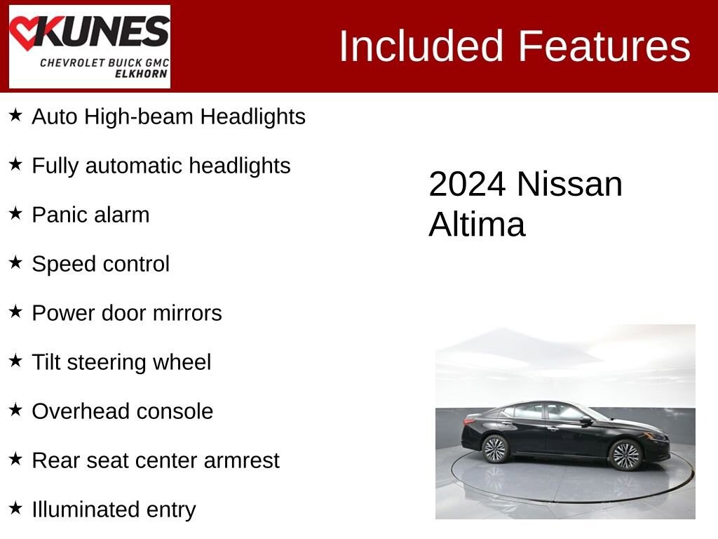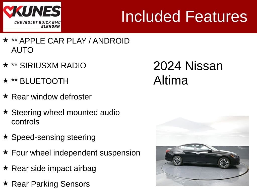 2024 Nissan Altima 2.5 SV Super Black Clearcoat FWD 2.5L 4-Cylinder DOHC 16VRecent Arrival! Clean CARFAX. CARFAX One Owner. Dual illuminated USB charging ports for front and rear passengers Floor mats and trunk mat 8-inch touchscreen display with smartphone integration Blind spot warning system Rear automatic braking Rear cross traffic alert Lane departure warning Rear parking sensors and backup camera Nissan Intelligent Key with push button ignition Cruise control with steering wheel controls Remote engine start system Dual-zone automatic climate control Power driverâs seat Tilt/telescoping steering wheel LED projector headlights with signature daytime running lights Advanced driver-assist display Bluetooth hands-free phone system SiriusXM radio capability Tire pressure monitoring system with easy-fill alert