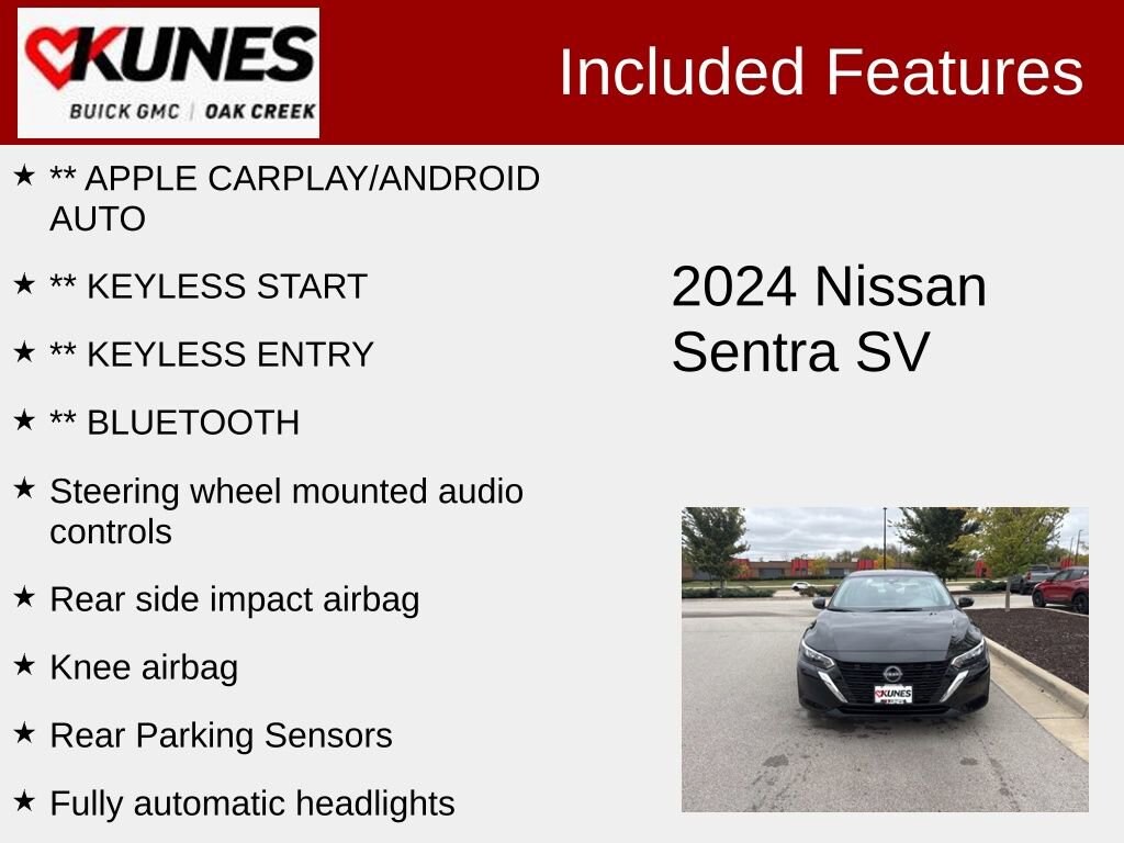 ** APPLE CARPLAY/ANDROID AUTO, ** KEYLESS START, ** KEYLESS ENTRY, ** BLUETOOTH, CVT with Xtronic, Charcoal Cloth, Auto High-beam Headlights, Delay-off headlights, Fully automatic headlights, Knee airbag, Leather steering wheel, Panic alarm, Rear Parking Sensors, Rear side impact airbag, Security system, Speed control, Steering wheel mounted audio controls, Technical Spec Change 2.Milwaukee's newest Buick GMC with the best available inventory in the midwest.2024 Nissan Sentra SV 2.0L I4 DOHC CVT with Xtronic FWD CARFAX One-Owner. Clean CARFAX. Odometer is 1431 miles below market average! 30/40 City/Highway MPGFind out why our dealerships have won DealerRater.com DEALER OF THE YEAR a whopping 10 TIMES! Call, email, or live chat with one of our friendly sales professionals now to schedule your test drive! Prices shown do not include tax, title, registration and $499 service fees.