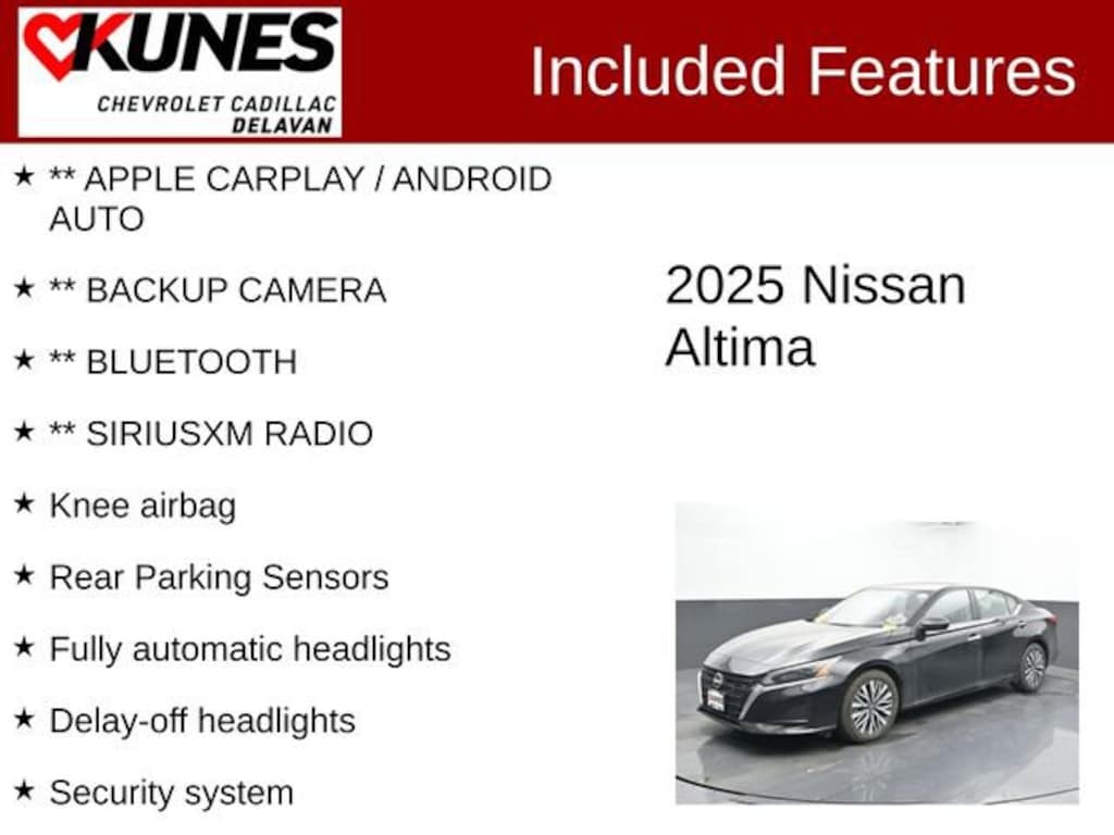 2025 Nissan Altima 2.5 SV Super Black Clearcoat FWD 2.5L 4-Cylinder DOHC 16VRecent Arrival! Floor mats, trunk mat, hideaway trunk net, and dual trunk hooks included. Blind spot warning and rear cross traffic alert for added safety. Intelligent cruise control for convenience on the highway. Rear automatic braking and rear parking sensors provide extra parking support. LED projector headlights with signature daytime running lights. 8-way power driver's seat for customized comfort. Remote engine start system with intelligent climate control. NissanConnect with 8-inch touchscreen display. Dual-zone automatic temperature control. Apple CarPlay and Android Auto compatibility. 6-speaker audio system with SiriusXM capability. Push button start and proximity keyless entry. Two front USB charging ports plus two rear USB charge ports. Lane departure warning and intelligent driver alertness system. High beam assist for improved nighttime visibility. 17-inch alloy wheels and temporary spare tire. Rear seat reminder feature. LATCH system for child seat safety.