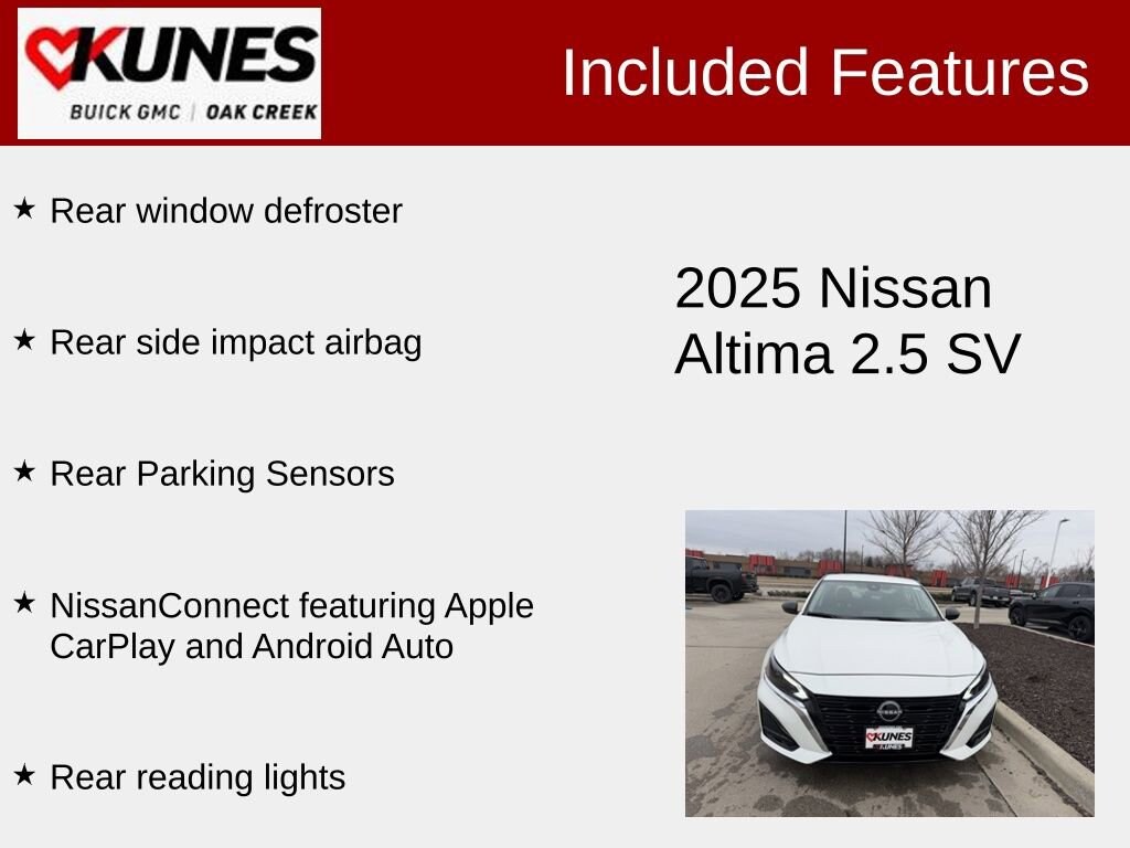 2025 Nissan Altima 2.5 SV 2.5L 4-Cylinder DOHC 16V CVT with Xtronic FWD CARFAX One-Owner. Clean CARFAX. 27/39 City/Highway MPG