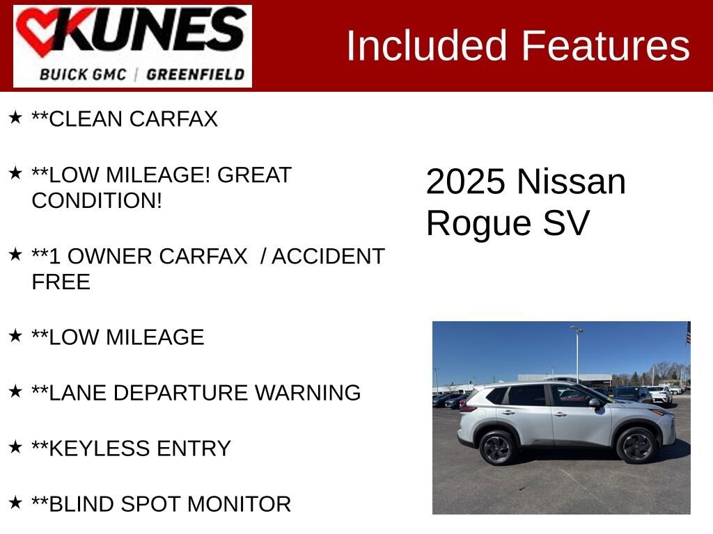 **APPLE CAR PLAY / ANDROID AUTO, **BACK UP CAMERA, **BLUETOOTH, **KEYLESS START, **ALL WHEEL DRIVE, **REAR PARK ASSIST, **GREAT FUEL ENCONOMY, **AFFORDABLE FINANCING, **NON SMOKER, **CLEAN CARFAX, **LOW MILEAGE! GREAT CONDITION!, **1 OWNER CARFAX / ACCIDENT FREE, **LOW MILEAGE, **LANE DEPARTURE WARNING, **KEYLESS ENTRY, **BLIND SPOT MONITOR, AWD, 6 Speakers, AM/FM radio: SiriusXM, Automatic temperature control, Front dual zone A/C, Front reading lights, Knee airbag, Overhead airbag, Radio data system, Radio: NissanConnect with 6 Speakers, Rear window defroster, Speed-sensing steering, Steering wheel mounted audio controls, Trip computer. CARFAX One-Owner. Certified. 28/35 City/Highway MPG Odometer is 1847 miles below market average! Priced below KBB Fair Purchase Price!Brilliant Silver Metallic 2025 Nissan Rogue SV 4D Sport Utility AWD CVT with Xtronic 1.5L DOHCCertification Program Details:** NO FEAR LIFETIME CERTIFIED PREOWNED **Over $2,895 of value at no cost!*LIFETIME WARRANTY!*3 Day Exchange Policy!*Complimentary powertrain warranty with ability to upgrade to fully comprehensive coverage and/or extend up to 125,000 miles!*125+ Point Inspection by our factory trained ASE Certified technicians and reconditioned to the highest standards.*Complimentary AutoCheck History Report*Complimentary AutoCheck Buyback Protection*Financing for Everyone - Guaranteed credit approval regardless of credit history!*Over 30 lenders who compete to get you the best financing terms*No payments for up to 90 days!*Weekly, Bi-Weekly, and Monthly Payment Options for all buyers!*First Free Oil Change!*Trade anytime policy - cars, trucks, boats, RVs, motorcycles - as long as we donât have to feed it, you can trade it!Find out why our dealerships have won DealerRater.com DEALER OF THE YEAR a whopping 10 TIMES! Call, email, or live chat with one of our friendly sales professionals now to schedule your test drive! Prices shown do not include tax, title, registration and $599 service fees.