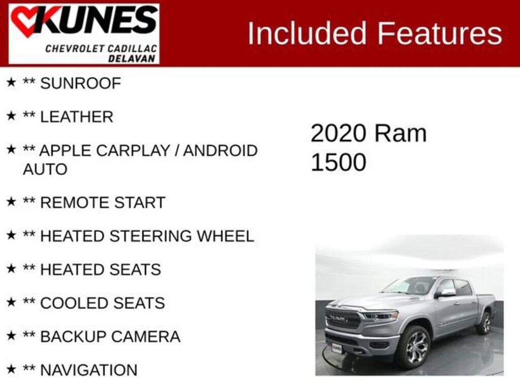 2020 Ram 1500 Limited Billet Silver Metallic Clearcoat 4WD HEMI 5.7L V8 Multi Displacement VVTRecent Arrival! Clean CARFAX. CARFAX One Owner. Limited Level 1 Equipment Group with adaptive cruise control, lane keep assist, lane departure warning, cross-traffic alert, and forward collision mitigation Panoramic sunroof/moonroof Premium sound system Heated and ventilated front and rear leather seats Blind spot monitoring system Rear parking sensors and backup camera Trailer brake controller Power retractable running boards 5.7L V8 engine, 8-speed automatic transmission, four-wheel drive Air suspension for improved ride and handling Navigation system with satellite radio and Bluetooth Aluminum performance wheels, performance tires Tow hooks and privacy glass Power folding mirrors with integrated turn signals and auto-dimming Rain-sensing and variable speed intermittent wipers Remote engine start and keyless entry Heated steering wheel with memory settings Universal garage door opener WiFi hotspot and telematics system Tire pressure monitor and stability control Multiple advanced airbags, rear head air bags, and child safety locks