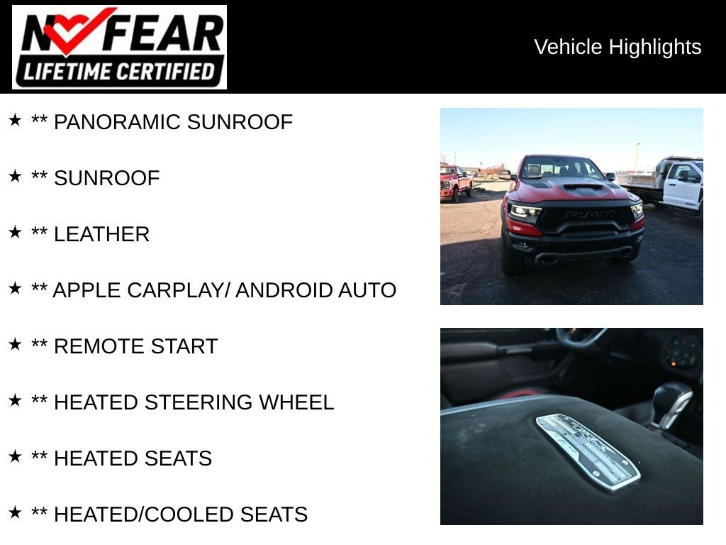 ** PANORAMIC SUNROOF, ** SUNROOF, ** LEATHER, ** APPLE CARPLAY/ ANDROID AUTO, ** REMOTE START, ** HEATED STEERING WHEEL, ** HEATED SEATS, ** HEATED/COOLED SEATS, ** BACKUP CAMERA, ** NAVIGATION, ** REAR PARK ASSIST, ** BLUETOOTH, ** ADAPTIVE CRUISE, #2 Seat Foam Cushion, 10 Speakers, 3.55 Rear Axle Ratio, 4 Way Front Headrests, Black Exterior Mirrors, Body Color Door Handles, Center Console Parts Module, Cloth/Vinyl Bucket Seats, Compass, Delay-off headlights, Digital Rearview Mirror, Dome Dual LED Reading Lamp, Driver door bin, Exterior Mirrors Courtesy Lamps, Front Center Armrest w/Storage, Front Door Accent Lighting, Front reading lights, Front Seat Back Map Pockets, Full Length Premium Upgraded Floor Console, harman/kardon 19 Speaker Premium Sound, Illuminated entry, IP LED Ambient Light Pipe, Leather Shift Knob, LED CHMSL Lamp, Luxury Front Door Trim Panel, MOPAR 4 Adjustable Cargo Tie-Down Hooks, MOPAR Bright Pedal Kit, MOPAR Deployable Bed Step, Outside temperature display, Overhead console, Passenger door bin, Passenger vanity mirror, Pick-Up Box Lighting, Power 8-Way Driver & Passenger Seats, Premium Wrapped IP Bezel, Radio: Uconnect 5 Nav w/12.0" Display, Rear 60/40 Folding Split Recline Seat, Rear Door Accent Lighting, Rear seat center armrest, Rear Underseat Compartment Storage, Remote Tailgate Release, Split folding rear seat, Sport steering wheel, Sun Visors w/Illuminated Vanity Mirrors, Surround View Camera System, Tachometer, Tailgate Ajar Warning Lamp, Telescoping steering wheel, Tilt steering wheel, Trailer Light Check, Tri-Fold Tonneau Cover, Ventilated Rear Seats, Voltmeter, Wheels: 18" x 9" Black Paint/Polish Aluminum, Wireless Charging Pad.