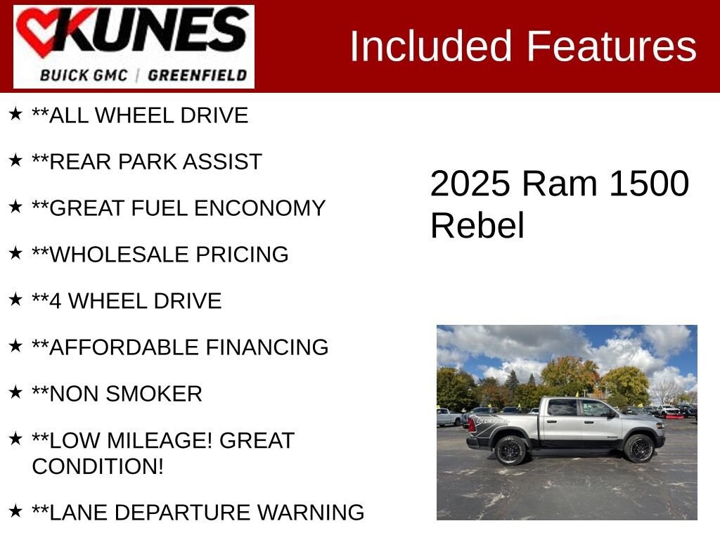 2025 Ram 1500 Rebel Billet Silver Metallic Clearcoat 4WD 3.0L I6Recent Arrival! Clean CARFAX. CARFAX One Owner.NO FEAR LIFETIME CERTIFIED PREOWNED **Over $2,895 of value at no cost!LIFETIME WARRANTY!3 Day Exchange Policy!Complimentary powertrain warranty with ability to upgrade to fully comprehensive coverage and/or extend up to 125,000 miles!125+ Point Inspection by our factory trained ASE Certified technicians and reconditioned to the highest standards.Complimentary AutoCheck History ReportComplimentary AutoCheck Buyback ProtectionFinancing for Everyone - Guaranteed credit approval regardless of credit history!Over 30 lenders who compete to get you the best financing termsNo payments for up to 90 days!Weekly, Bi-Weekly, and Monthly Payment Options for all buyers!First Free Oil Change!Trade anytime policy - cars, trucks, boats, RVs, motorcycles - as long as we don't have to feed it, you can trade it! Rebel Level 1 Equipment Group with heated front seats, power folding mirrors, adjustable pedals, and remote start Billet Silver Metallic Clearcoat paint Tow hitch and tow hooks Blind spot monitor Navigation system Cross-traffic alert WiFi hotspot Back-up camera with rear parking sensors Premium sound system Apple CarPlay and Android Auto Adaptive cruise control not indicated Power driver seat with adjustable lumbar Heated mirrors Power windows and power door locks Auto-dimming rearview mirror Remote engine start and smart device integration Lane departure warning and lane keeping assist Full-time four-wheel drive, 3.0L Turbocharged I-6 engine Automatic high-beams and LED headlights Aluminum wheels, privacy glass, blackout trim Cloth and vinyl bucket seats with leather steering wheel Multi-zone climate control