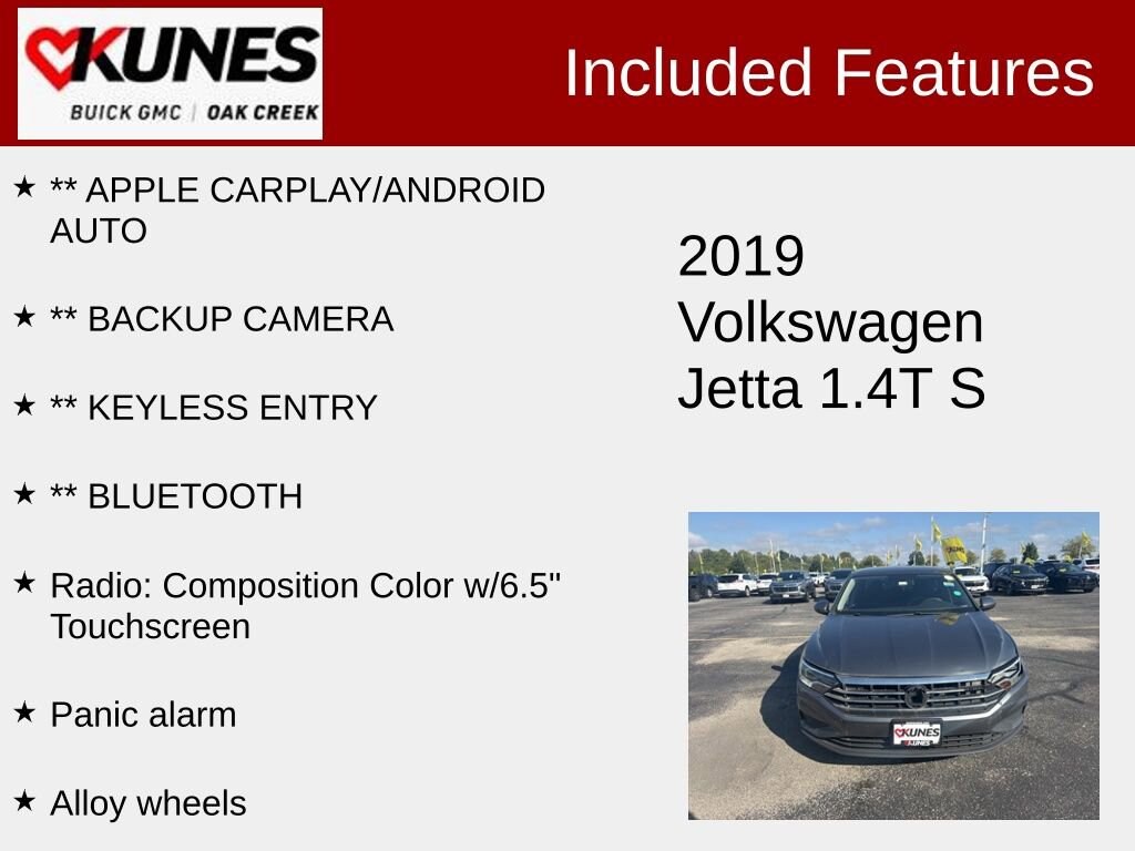 2019 Volkswagen Jetta 1.4T S Platinum Gray Metallic FWD 1.4L TSIRecent Arrival! Clean CARFAX. Cruise control for easier highway driving Apple CarPlay and Android Auto for smartphone connectivity Back-up camera for added parking safety Bluetooth, auxiliary audio input, and MP3 capability with steering wheel controls LED headlights with automatic daytime running lights 8-speed automatic transmission 1.4L I-4 turbocharged engine Keyless entry and power door locks Air conditioning and rear defrost Two LCD monitors in the front Front-wheel drive and 4-wheel disc brakes with brake assist Traction control and electronic stability control Front and rear head airbags, side airbags, and side impact beams Heated power mirrors Cloth seats and adjustable steering wheel Power windows and rear bench seat with pass-through Aluminum wheels with all-season tires Tire pressure monitoring system Child safety locks and latch for child seats Trip computer and redundant digital speedometer Full galvanized steel body panels and chrome side window trim