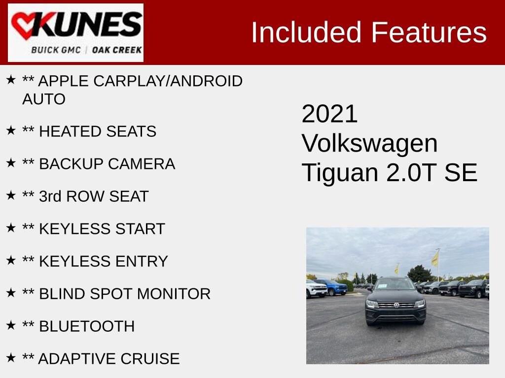 2021 Volkswagen Tiguan 2.0T SE Deep Black FWD 2.0L TSI DOHCRecent Arrival! Clean CARFAX. CARFAX One Owner. Floor mats, cargo shade, and an auto-dimming rearview mirror with universal garage door opener Heated front seats with power adjustment and adjustable lumbar Adaptive cruise control for convenient highway driving Blind spot monitor and rear cross-traffic alert Backup camera for easier reversing Apple CarPlay, Android Auto, Bluetooth, and WiFi hotspot Multi-zone automatic climate control Streaming audio and HD radio Keyless entry and push-button start 8-way power driverâs seat Rear seat pass-through for added cargo flexibility 3rd row seat for extra passenger capacity Aluminum wheels and privacy glass Heated mirrors with integrated turn signals Automatic headlights and daytime running lights Roof rails for extra cargo options Rear spoiler and chrome exterior accents Front collision mitigation and stability control 2.0L turbocharged engine with 8-speed automatic transmission Multi-link rear suspension for a smoother ride